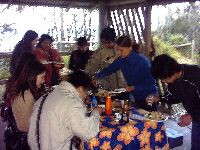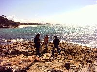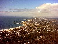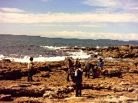 It was actually a late lunch and things got dark pretty quickly. Afterwards the tour took us to our hotel room. After freshening up the group headed in to the dining area of the hotel for dinner. Then, after this, Nick took us on a wild mystery tour in the dark! We went out into the scrub to see wombats in a field as well as some koalas and kangaroos. Everyone was excited to see native animals in their natural habitat in the lights of the bus! Pity my camera couldn't take night photos! We also got to see the stars. In the city, smog and the reflection from city lights obscure most of the stars so that you can only get to see the brightest. In the country, in areas where it is pitch black, there are so many stars in the sky that your jaw drops at how interesting they look. It was a beautiful sight. We decided to head back as a very important thing had to be done. It was agreed that some of the guys would join Nick for a beer or two at the pub, while wives and girlfriends rolled their eyes! The pub was in Nowra near our hotel room, and it turned out to be a blue collar pub with a rowdy dance party happening upstairs. Not meeting anyone's gaze and just ordering beer was the safest thing to do if you happened to be noticeably liberal or white collar looking. The next morning we were up bright and early. A quick stop at the Jervis Bay shops for fish and chips, and a look at the trinkets they had for sale, then on to Kangaroo Valley. On the way Nick took us on a couple of walks through the national park, as well as a few beach walks. Unfortunately the weather wasn't that good this weekend so it was umbrellas and raincoats for everyone. Nick took us on a really interesting walking tour that culminated in a pile of dirt and broken shells which seemed to be part of the landscape. We had no idea why we were taken off the beaten track to this secluded spot until Nick explained that for thousands of years this mound was the fish scaling place of the aborigines. Generations upon generations of various tribes that had lived in the area had left their shells, scales, fish parts and other biodegradable rubbish here until it had actually become a prominant feature of the coastline. The National Park walk a bit later took us past a river and a waterfall but with all the rain we couldn't enjoy it that much. We eventually made it to the souvenir shop which sold some great souvenirs at National Park prices. Kangaroo Valley was a quiet, peaceful little tourist stop. There were other more adventurous options but no one on the tour wanted to do any of those. The Valley contained many shops selling souvenirs and trinkets but we ended up just buying some icecream and interesting looking lollies. (Kangaroo Valley shops avi) Actually there were so many varieties of money wasting trinket shops that girls love and guys hate. Outside one shop, one of the other guys and I rested on a seat specially made for men like us - called the 'Bored Husbands Seat'. Very apt. I'd bought a wide brimmed hat to wear before I went and decided that it would be given to Nick with tips in. After passing it around I handed it to Nick who was quite gobsmacked at the generosity. With all the hard work he put in, the fact that the fee we paid was quite cheap compared to other tours, and because he showed us a lot more on the tour than most people would, I thought it was the most appropriate thing to do. And the others on the tour tended to agree. The hat was quite heavy when I handed it too him! Definitely worthwhile. Back to more travelogues |