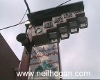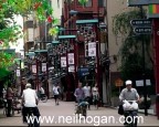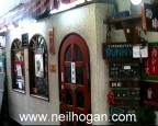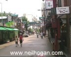 Behind the lamp, in front of the temple, between the various shops selling similar items, are many food places frequented by foreigners. Avoid these unless you need a menu in English. Locals will not go to these places. Behind the temple are many more restaurants and other eating establishments frequented by locals.