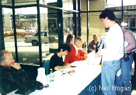 It cost $5 for the 3D glasses. So Peter & Colin were selling them outside. (See photo) Unfortunately my tape recorder didn't work so I didn't get Colin shouting $4.99 over here. $4.99. It was funny. I went up, gave him $5, said thanks and walked on. Without saying anything more. Colin gave me a funny look as though to say "You didn't act like a fanboy!" The costume parade was interesting. Especially the stand up comic Jamie