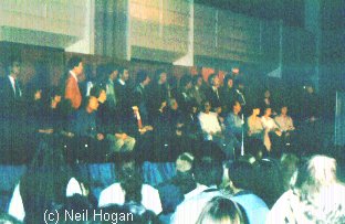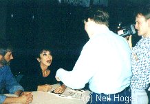 JNT sang! He also did a ventriloquist act with Wendy Padbury. I certainly wasn't expecting her to pop out of that suitcase. Still sexy for her age. Anthony Ainley was great. Funniest one there. Afterwards, joined a group in a room party. Met Lisa Truant. ('99 note. Congratulations, Lisa and Irwin on your marriage) She told me about Craig Charles discovering the after-con massage and reckoning it was something else, barged in. Unfortunately they'd set up a steamy scene for someone else and Craig looked acutely embarrassed. After I interviewed everyone for Doctor Who 2000 and joined DWIN, I